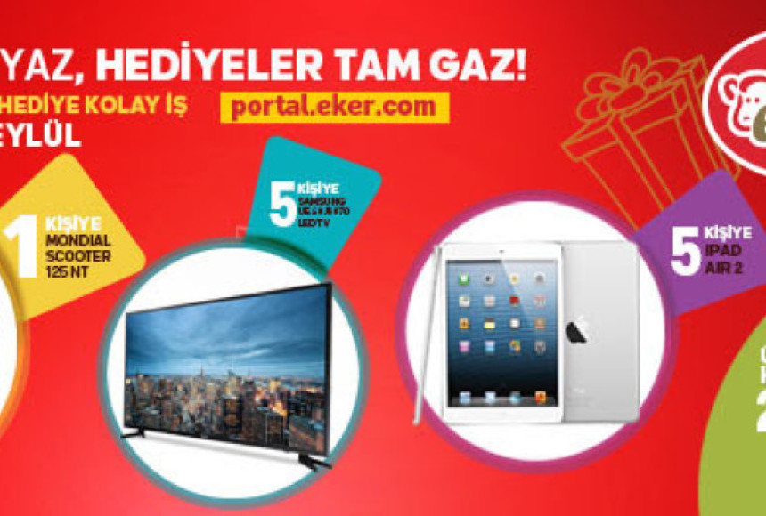 Eker süt ürünlerinde carisi olan müşteriler, 8 Ağustos – 30 Eylül 2016 Eylül tarihleri arasında portal.eker.com adresine kayıt olup , verdiği her 50 TL’lik alışverişe bir çekiliş hakkı kazanıyor. Milli Piyango Genel Müdürlüğü’nün 04.08.2016 tarih 40453693-255.01.02/1918-6273 sayılı izni ile yapılacak çekilişte 1 kişiye Mondial Scooter 125 NT, 5 kişiye Samsung UE 40J5070 LED tv ve 5 kişiye I Pad Aır 2 verilecek. Ayrıca Eker Portal’ a üye olan herkese çekilişsiz kurasız 24 adet Eker ayran bardağı hediye edilecek.