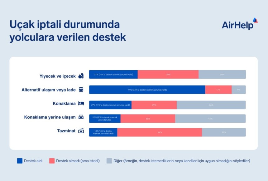 Uçuş iptallerinden etkilenen yolcular alternatif ulaşım veya tam para iadesi hakkına sahip oluyor. Ankete katılanların yüzde 74'ü de bu haklarına ulaştıklarını, ancak katılımcıların yüzde 33'ü bu haklarını talep ettikten sonra alabildiklerini aktardı. Uçuş iptali halinde, havayolu şirketlerinin gerekirse konaklama ve ulaşım da sağlaması gerekiyor. Ankete göre katılımcıların yalnızca yüzde 27'sine konaklama sağlanırken, yüzde 20'sinin ulaşım masrafları karşılanıyor.